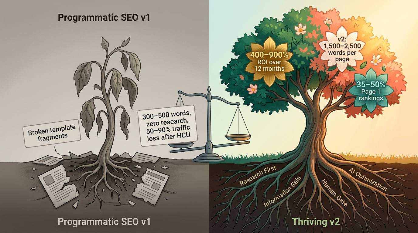 Traditional programmatic SEO failed because it produced low-quality, thin content that search engines learned to penalize. Programmatic SEO v2 takes a fundamentally different approach: research-first methodology applied at scale, with human oversight as a non-negotiable quality gate. The result is content that ranks in Google, earns citations from AI search engines like Perplexity and ChatGPT, and actually converts visitors.