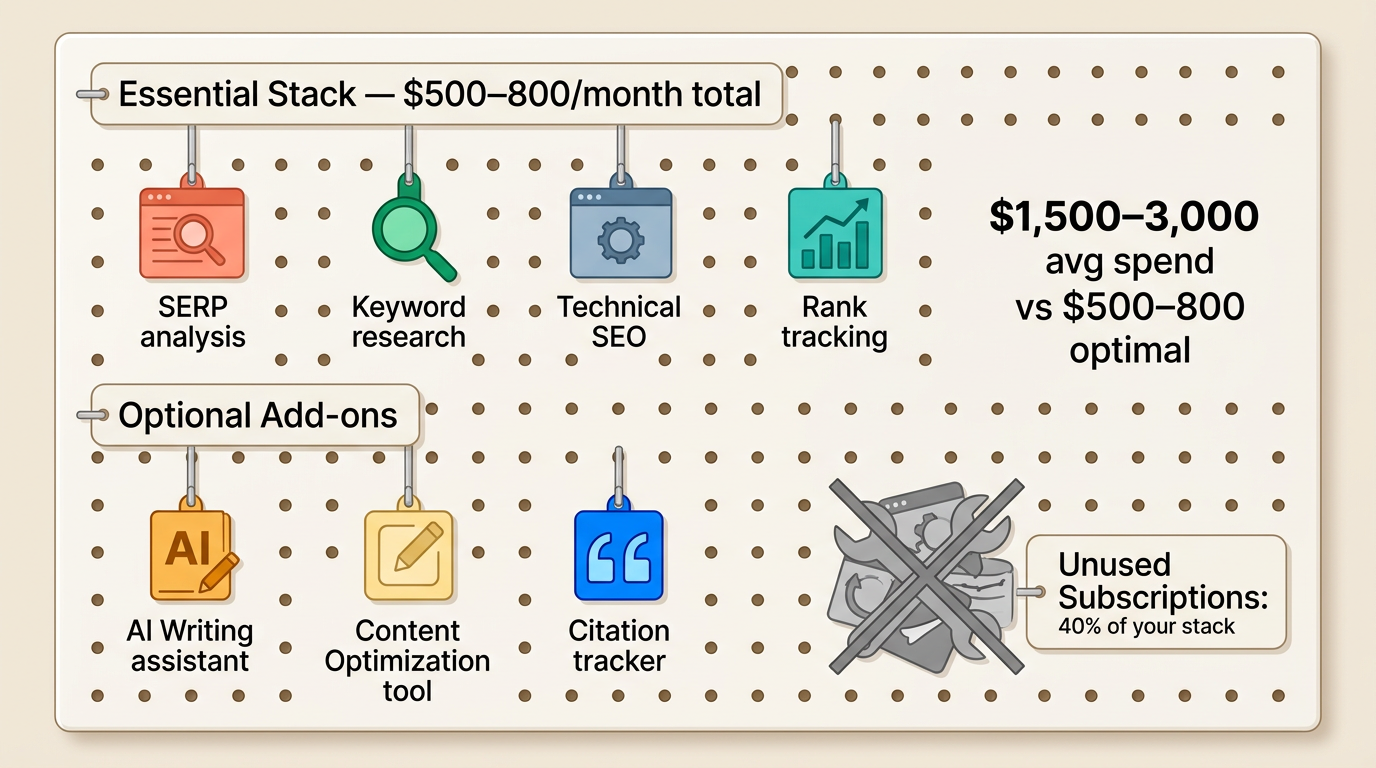 Most teams overspend on SEO tools. The average team spends $1,500-3,000/month but could achieve better results with $500-800/month by choosing the right stack.